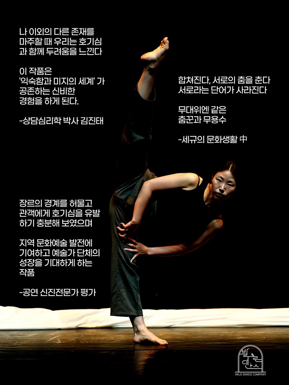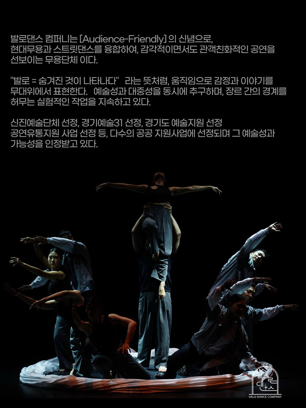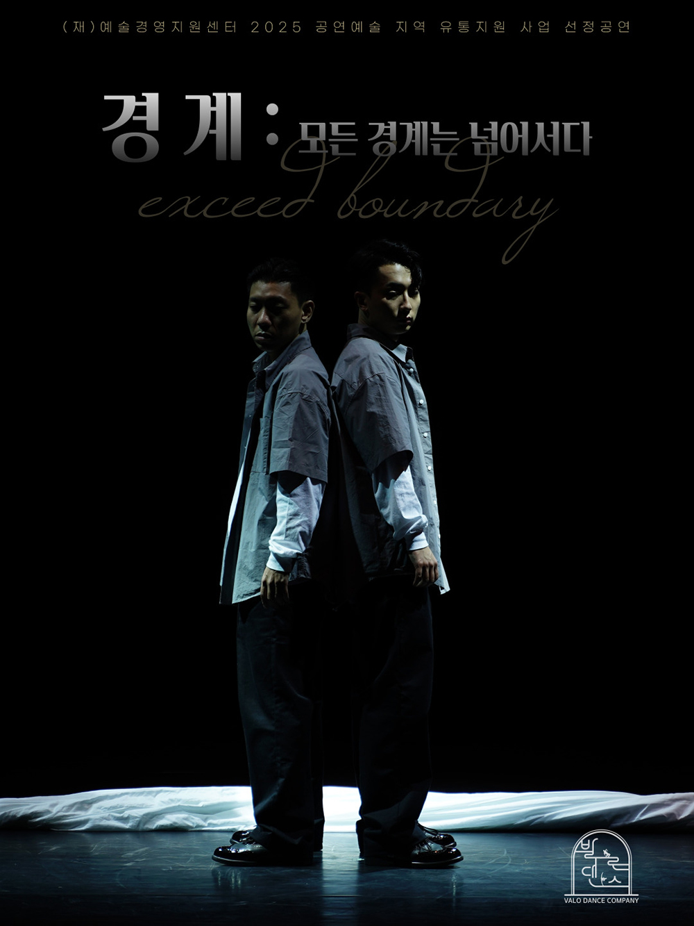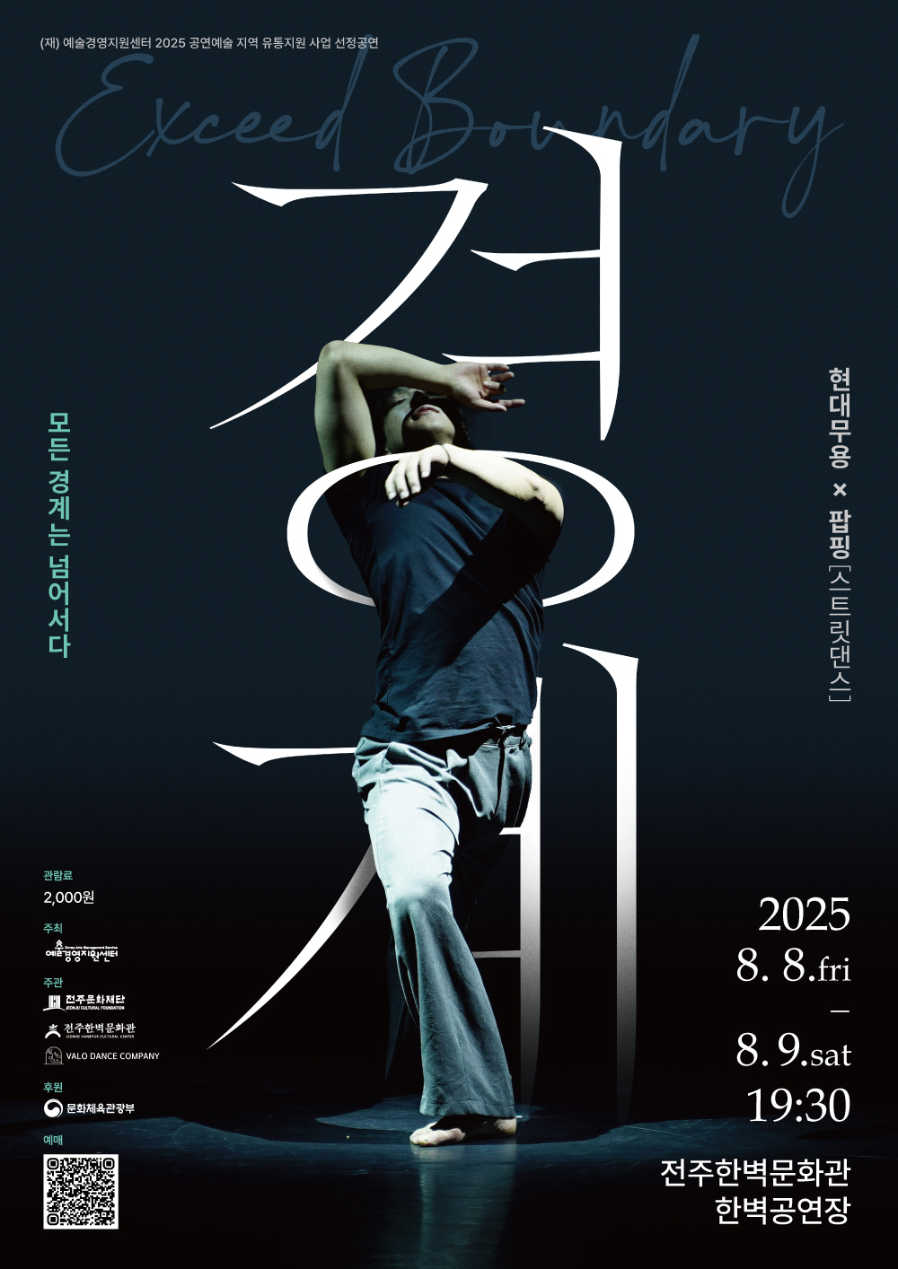 ABOUT PERFORMANCE 공연정보 상세보기 공 연 명 : 경계:모든 경계는 넘어서다. 공연일시 : 2025년08월 08일(금) ~ 09일(토) 19:30 공연장소 : 전주한벽문화관 한벽공연장 런닝타임 : 60분(인터미션 없음) 티켓금액 : S석 : 2,000원 할인정보 : 주최 : 예술경영지원센터 주관 : 전주문화재단, 전주한벽문화관, 발로댄스컴퍼니 공연문의 : 063-280-7082 연령제한 : 만3세 이상 관람 가능