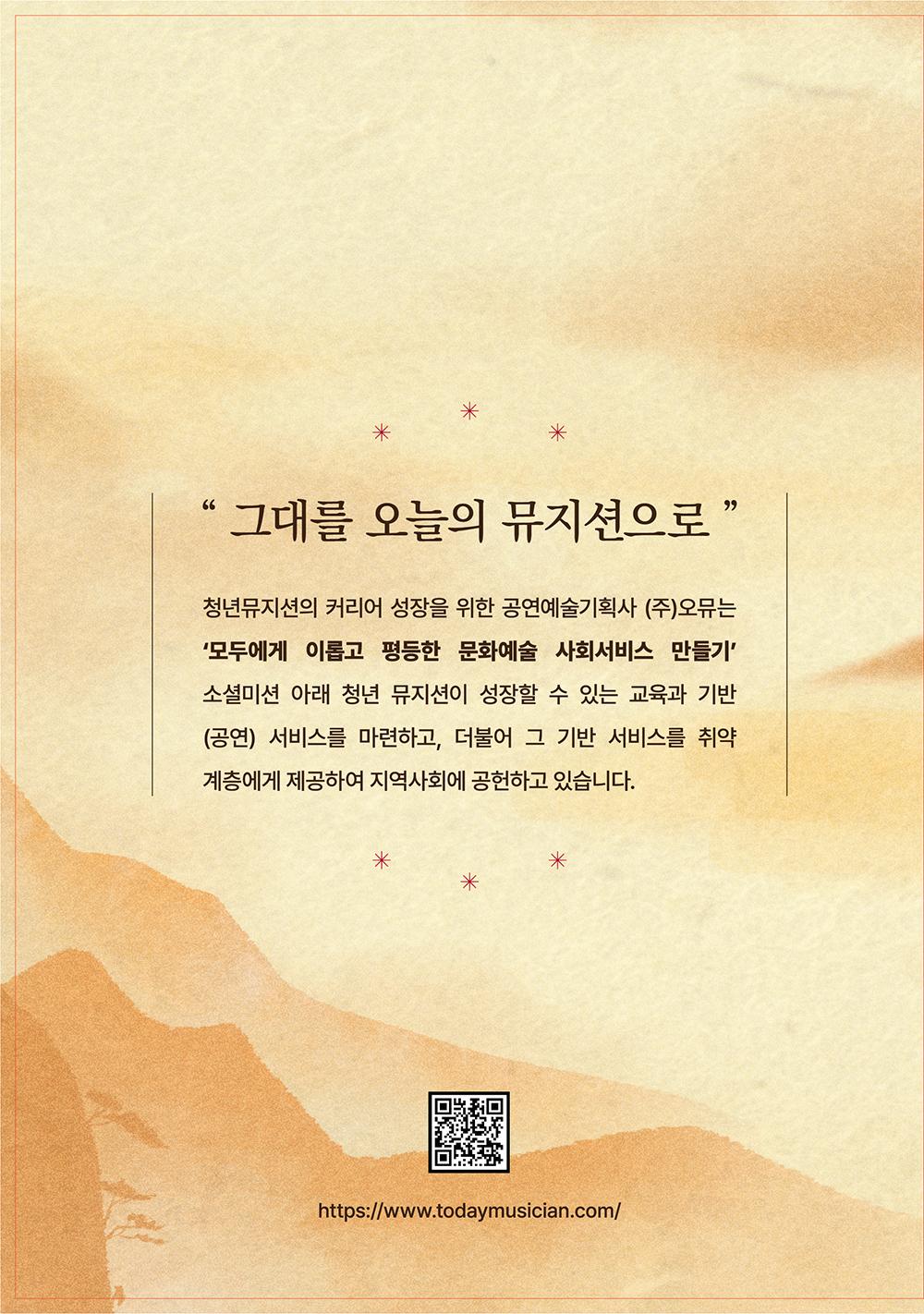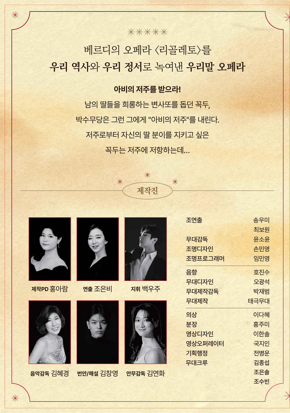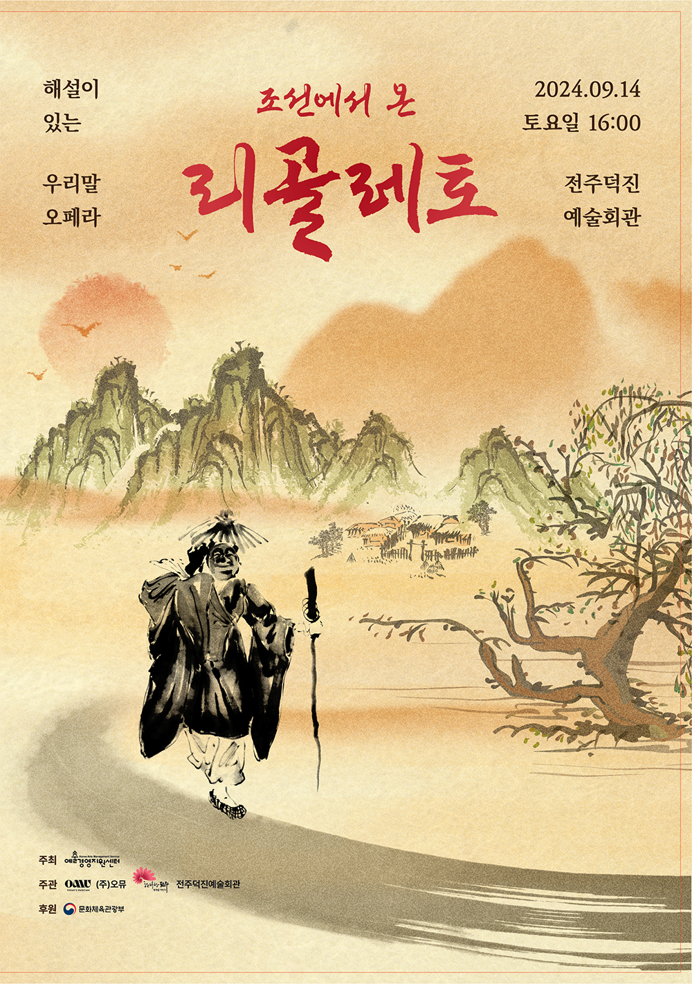 ABOUT PERFORMANCE 공연정보 상세보기 공 연 명 : 조선에서 온 리골레토 공연일시 : 2024년 9월 14일(토) 16:00 공연장소 : 덕진예술회관 런닝타임 : 80분 티켓금액 : S석 : 10,000원 할인정보 : 전주시민 30% 할인 주최 : 예술경영지원센터 주관 : 주식회사 오뮤, 전주시, 전주덕진예술회관 공연문의 : 010-4497-9879 연령제한 : 만 7세 이상 괌람가능 전주시민 30% 할인