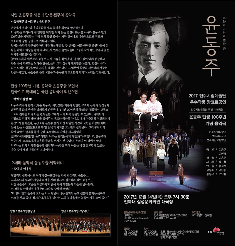 - 공 연 명 : 2017 전주시립예술단 우수작품 앙코르공연 전주시립합창단 특별기획공연 윤동주 탄생 100주년 기념음악극