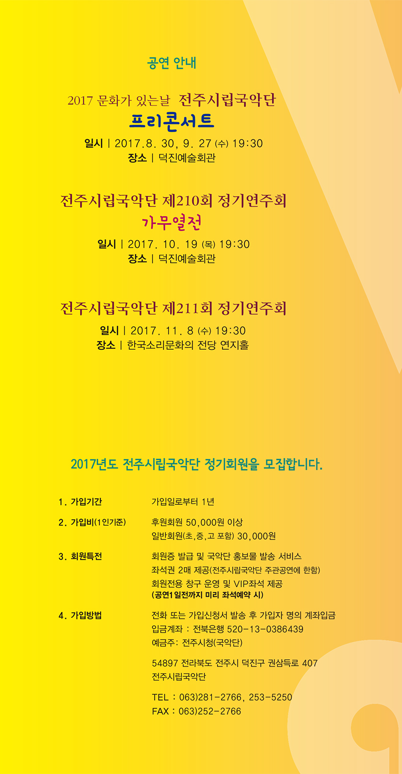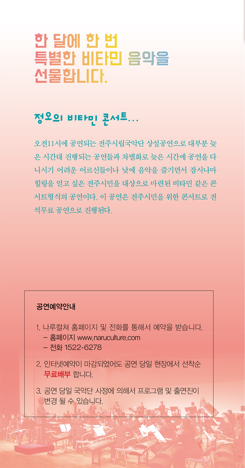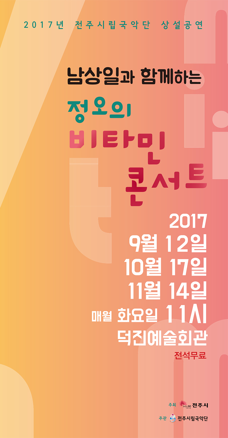 ABOUT PERFORMANCE 공연정보 상세보기 공 연 명 : 전주시립국악단 상설공연 - 남상일과 함께하는 정오의 비타민 콘서트 공연일시 : 2017.09.12/10.17/11.14 (화) 오전 11:00 공연장소 : 덕진예술회관 런닝타임 : 티켓금액 : 무료공연 할인정보 : 주최 : 전주시 주관 : 전주시립국악단 공연문의 : 063-281-2766 연령제한 : 본 공연은 만8세이상 관람이 가능합니다 전주 시민을 위한 무료공연입니다