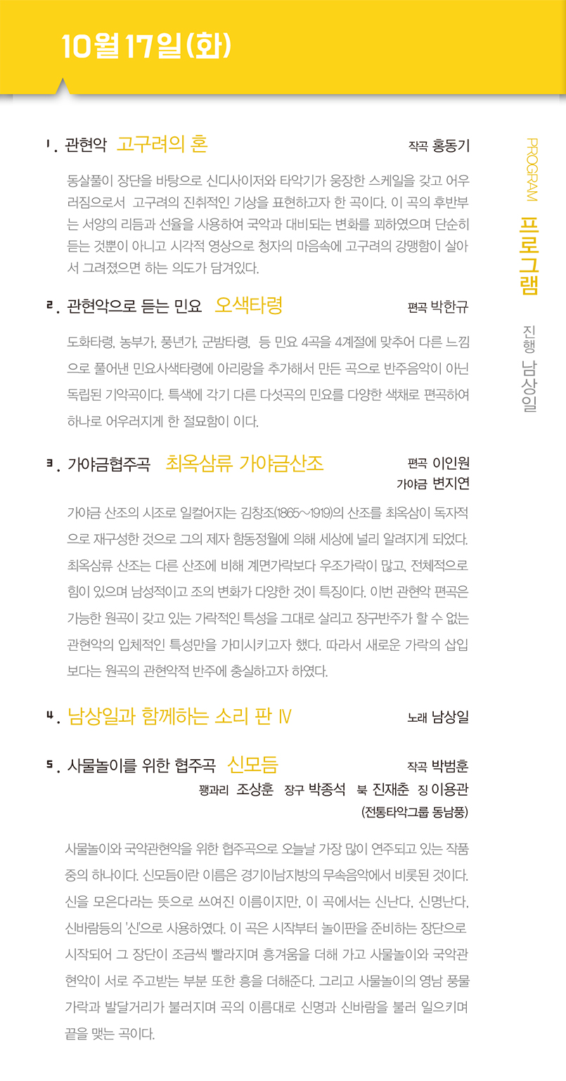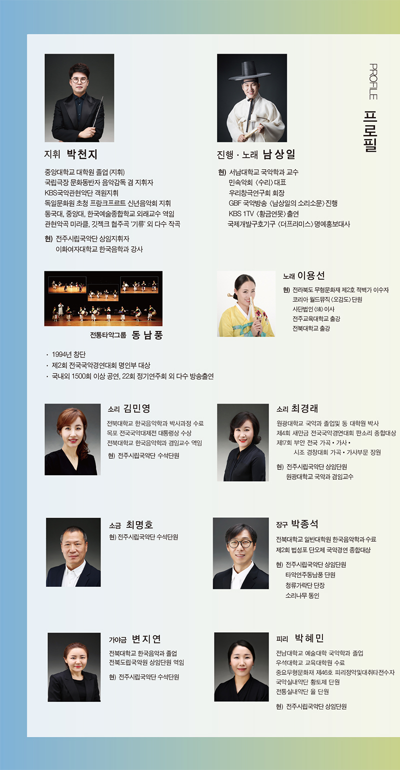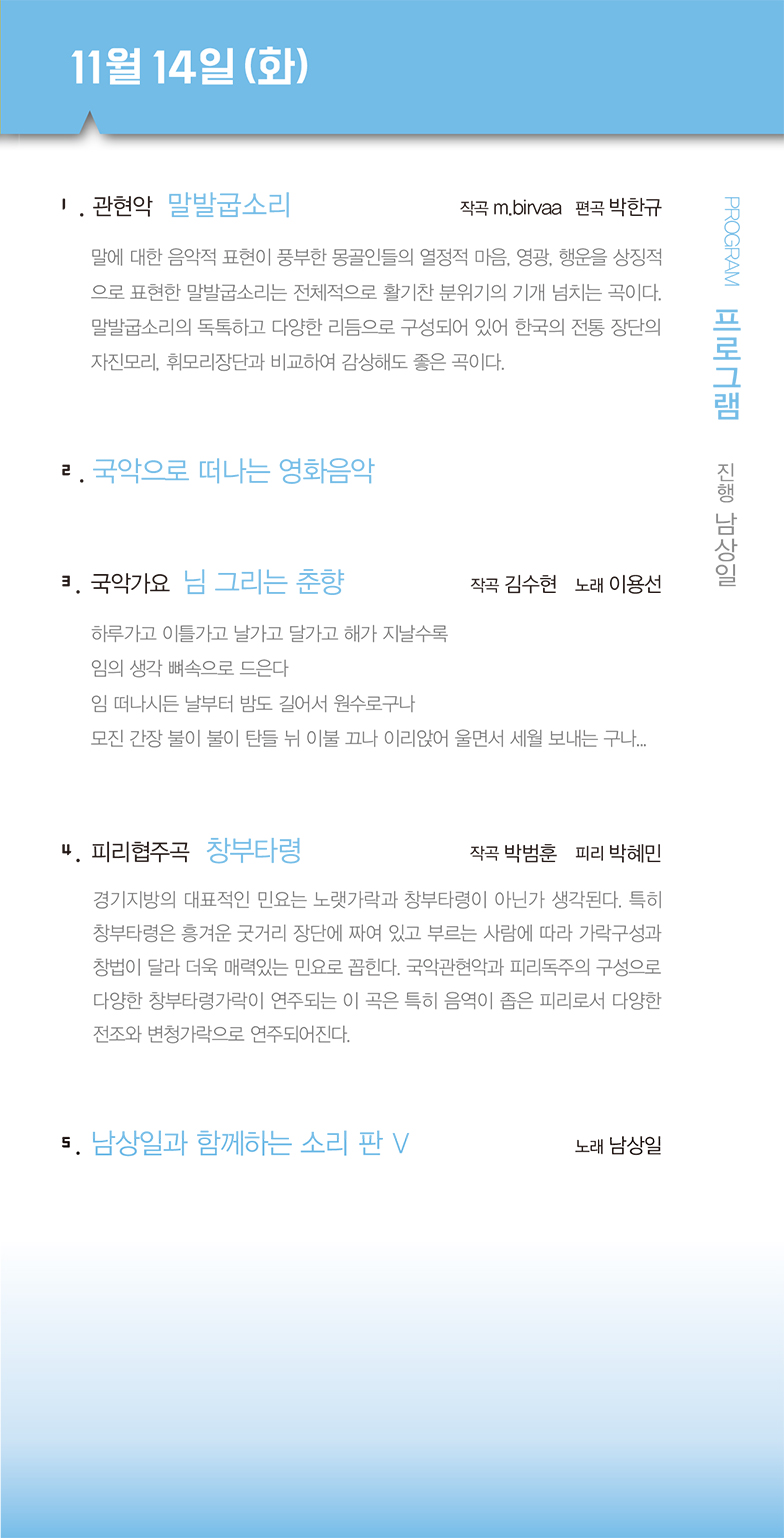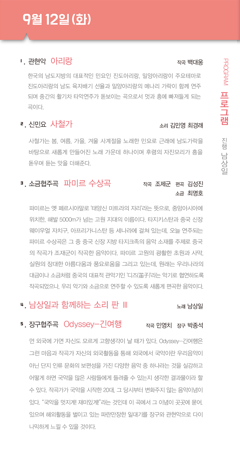 ABOUT PERFORMANCE 공연정보 상세보기 공 연 명 : 전주시립국악단 상설공연 - 남상일과 함께하는 정오의 비타민 콘서트 공연일시 : 2017.09.12/10.17/11.14 (화) 오전 11:00 공연장소 : 덕진예술회관 런닝타임 : 티켓금액 : 무료공연 할인정보 : 주최 : 전주시 주관 : 전주시립국악단 공연문의 : 063-281-2766 연령제한 : 본 공연은 만8세이상 관람이 가능합니다 전주 시민을 위한 무료공연입니다