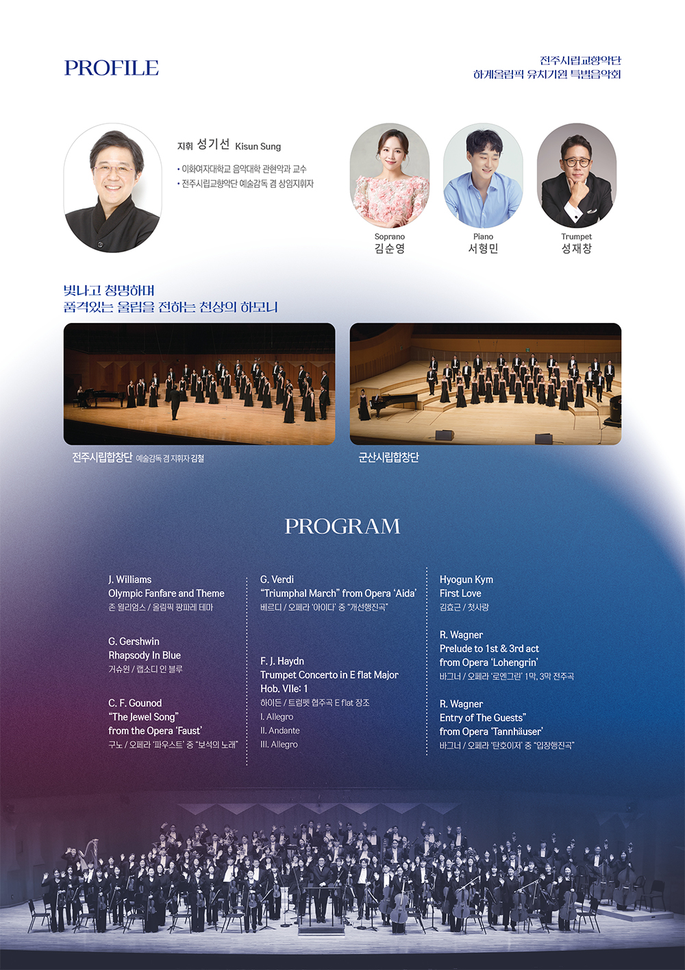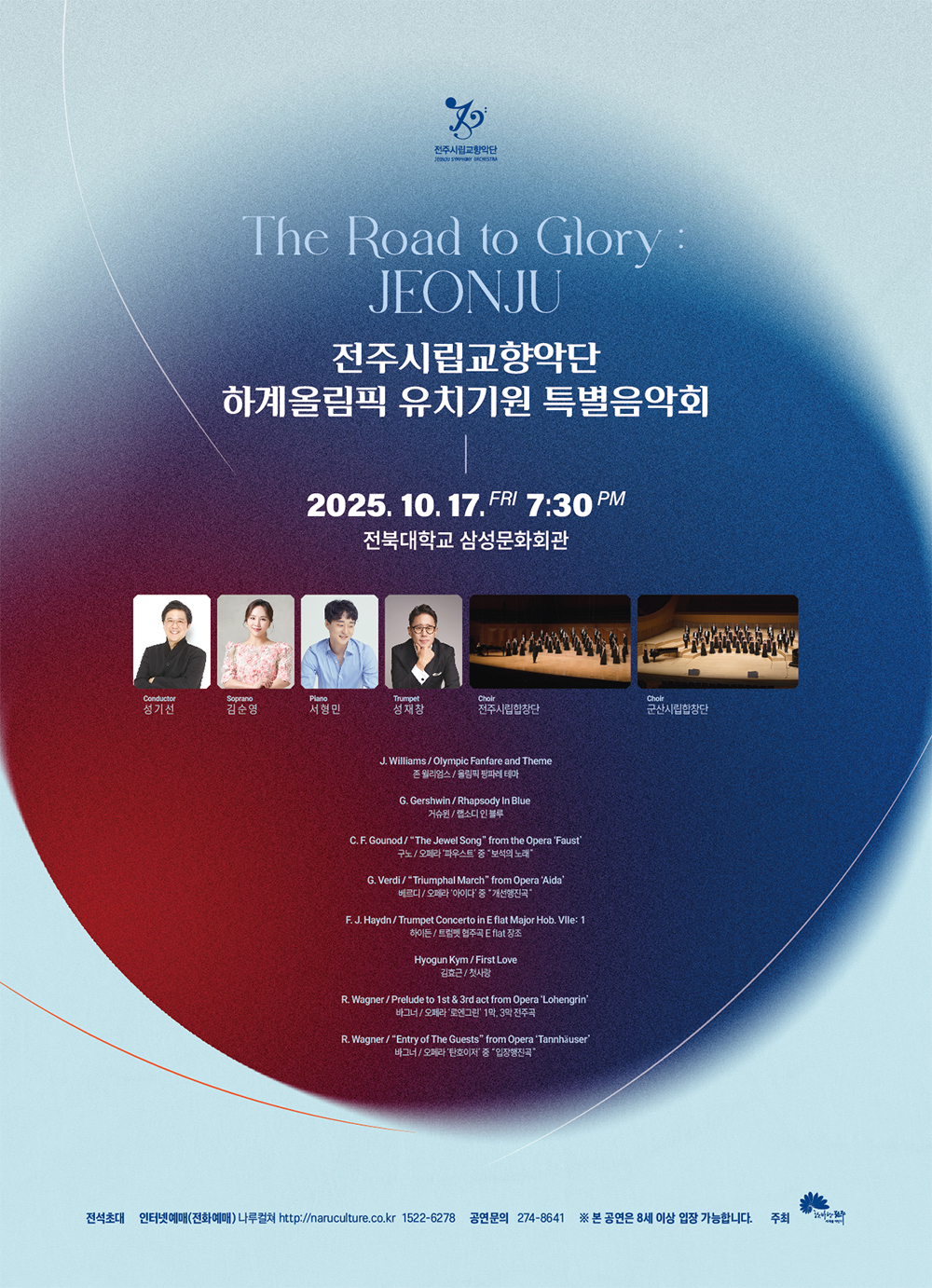 ABOUT PERFORMANCE 공연정보 상세보기 공 연 명 : 전주시립교향악단 하계올림픽 유치기원 특별음악회 공연일시 : 2025년 10월 17일(금) 19:30 공연장소 : 전북대학교 삼성문화회관 런닝타임 : 90분 티켓금액 : 무료공연 할인정보 : 주최 : 전주시 주관 : 전주시립교향악단 공연문의 : 063-274-8641 연령제한 : 8세 이상 관람 가능 전석무료 공연입니다