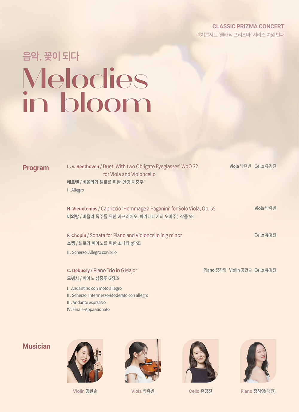 ABOUT PERFORMANCE 공연정보 상세보기 공 연 명 : 음악, 꽃이 되다 Melodies in bloom 공연일시 : 2026년 04월 03일(금) 19:30 공연장소 : 전주시립예술단 다목적홀 런닝타임 : 80분 티켓금액 : 무료공연 할인정보 : 주최 : 전주시 주관 : 전주시립교향악단 공연문의 : 063-274-8641 연령제한 : 8세 이상 관람 가능 예매하기 1인 2매만 구매가능