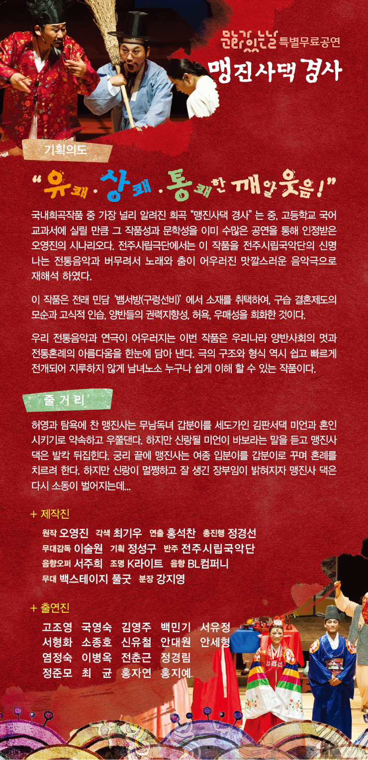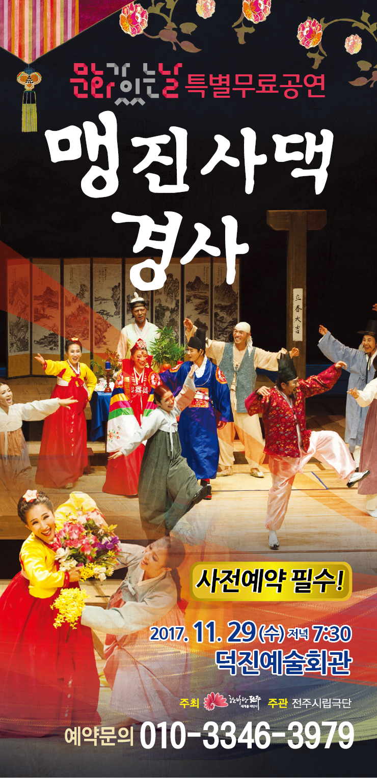 ABOUT PERFORMANCE 공연정보 상세보기 공 연 명 : 문화가 있는 날 특별무료공연 맹진사댁 경사 공연일시 : 2017년 11월 29일(수) 오후 07:30 공연장소 : 덕진예술회관 런닝타임 : 티켓금액 : 무료공연 할인정보 : 주최 : 전주시 주관 : 전주시립극단 공연문의 : 010-3346-3797 연령제한 :
