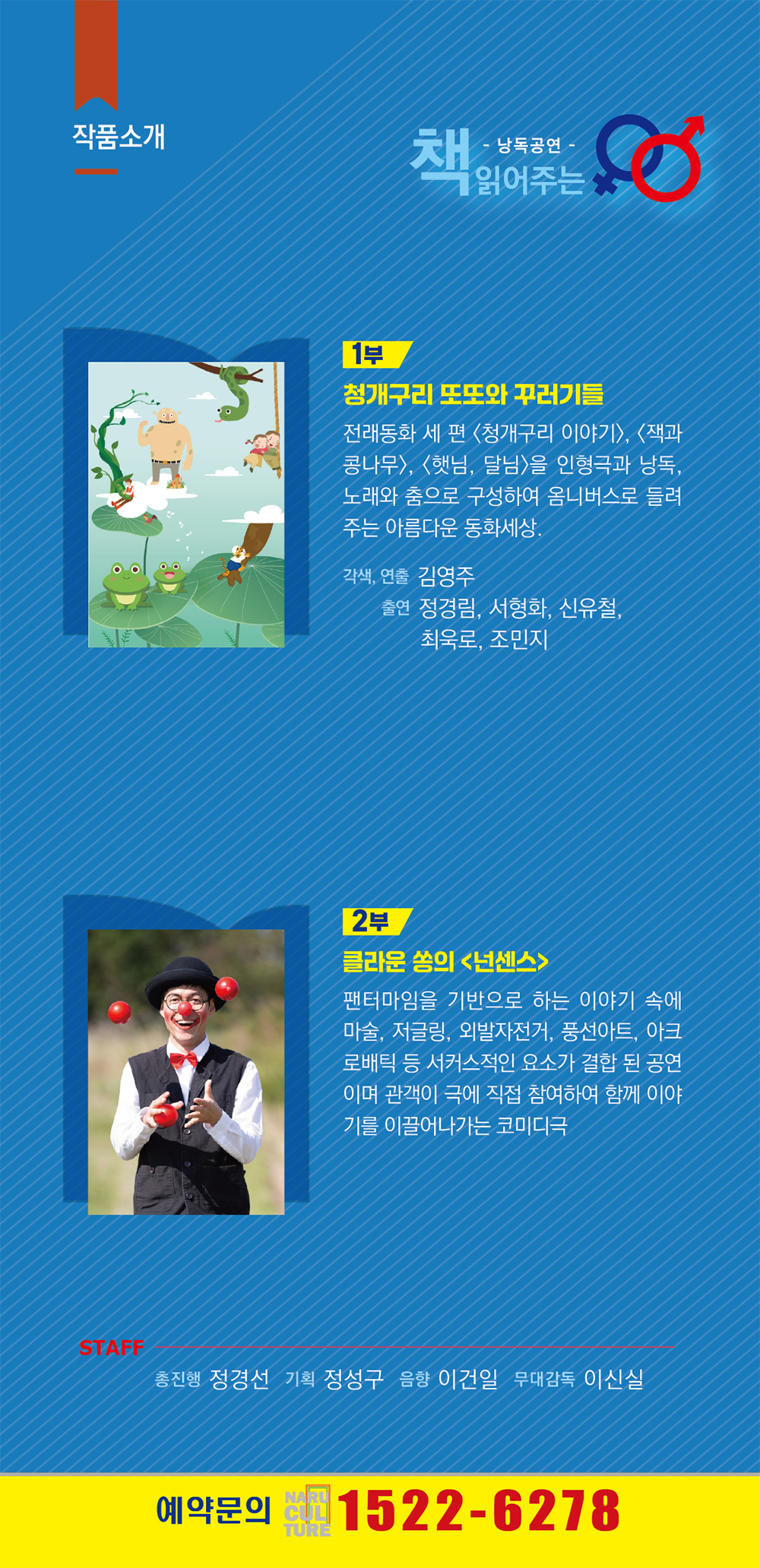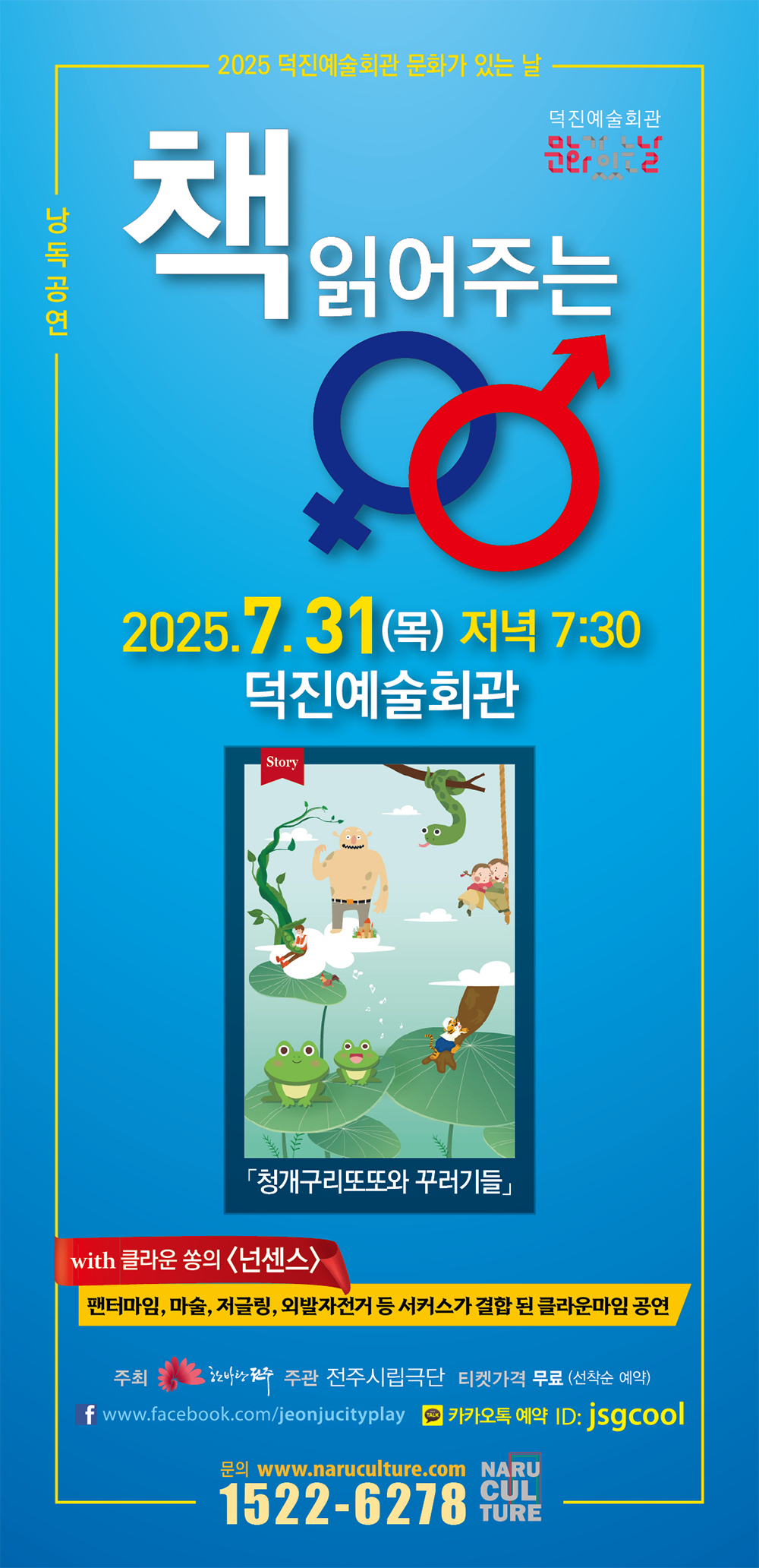 ABOUT PERFORMANCE 공연정보 상세보기 공 연 명 : 책 읽어주는 남녀 - 청개구리또또와 꾸러기들 공연일시 : 2025년 07월 31일(목) 19:30 공연장소 : 덕진예술회관 런닝타임 : 70분 티켓금액 : 무료공연 할인정보 : 주최 : 전주시 주관 : 전주시립극단 공연문의 : 063-275-1044 연령제한 : 5세 이상 관람가능