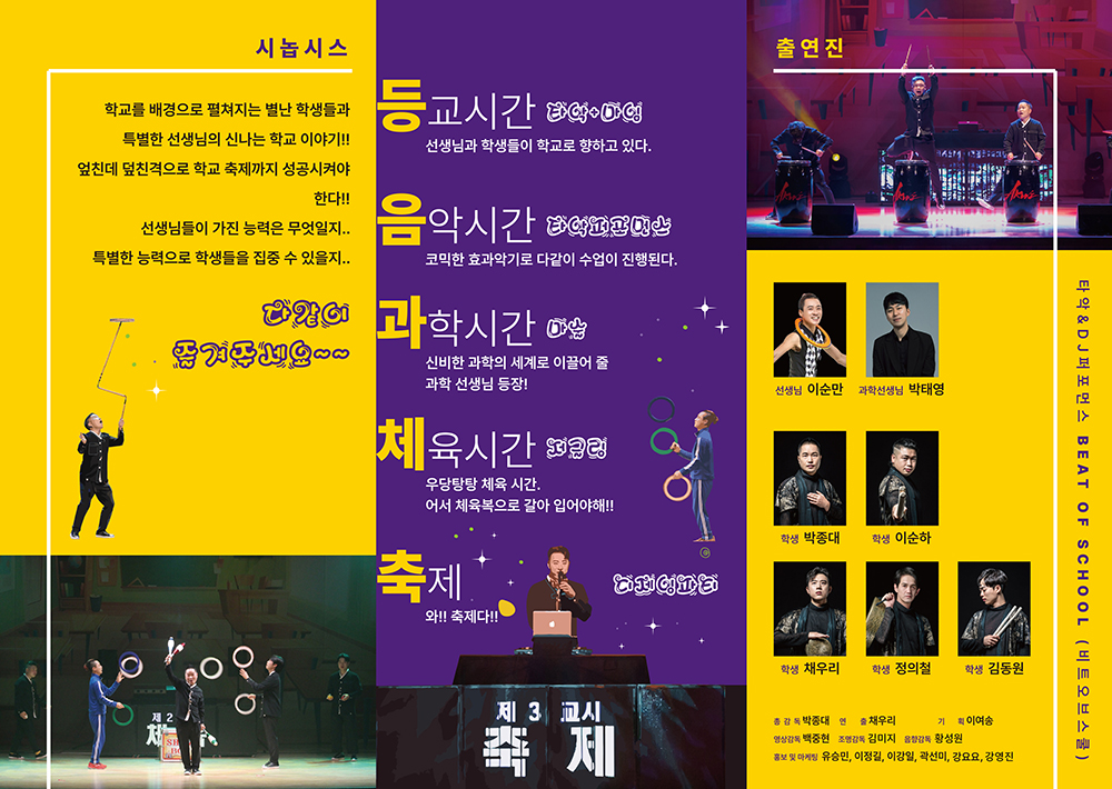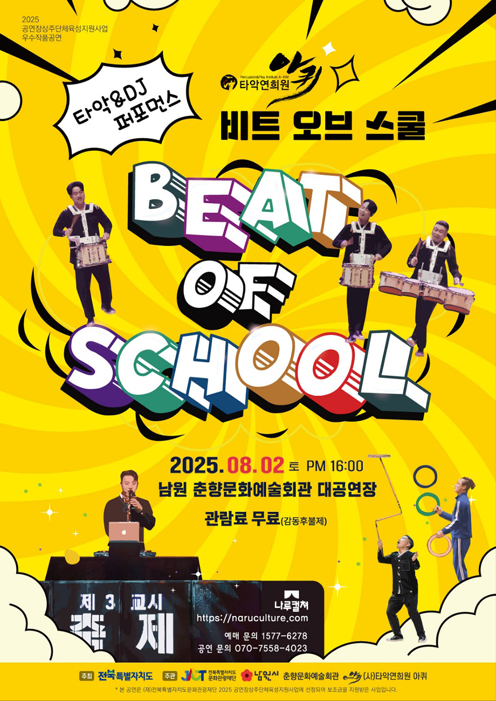 ABOUT PERFORMANCE 공연정보 상세보기 공 연 명 : 타악&DJ퍼포먼스 비트오브스쿨(Beat Of School) 공연일시 : 2025년 08월 02일(토) 16:00 공연장소 : 춘향문화예술회관 런닝타임 : 60분(인터미션 없음) 티켓금액 : 무료공연 할인정보 : 주최 : 전북특별자치도,전북특별자치도문화관광재단, 남원시, 춘향문화예술회관 주관 : (사)타악연희원 아퀴 공연문의 : 070-7558-4023 연령제한 : 전 연령 관람가능