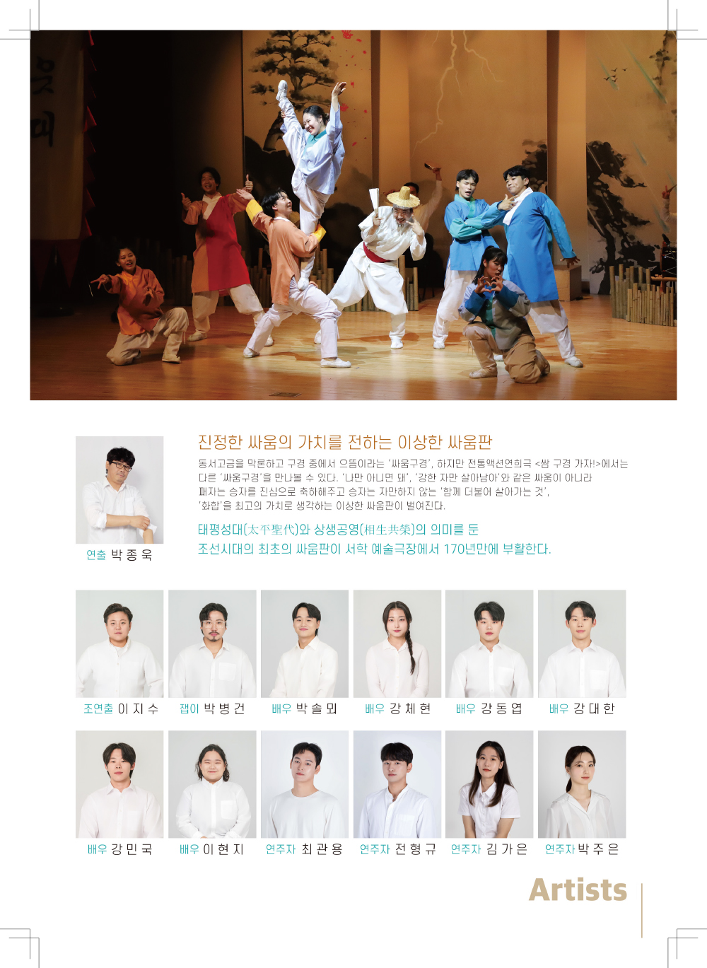 ABOUT PERFORMANCE 공연정보 상세보기 공 연 명 : 2025서학예술극장 여기 잇다 - 쌈구경가자 공연일시 : 2025 07월 25일(금) 19:30 공연장소 : 서학예술극장 런닝타임 : 60분 티켓금액 : 무료공연 할인정보 : 주최 : 전북특별자치도 문화관광재단 주관 : 서학예술극장 공연문의 : 063-231-8881 연령제한 : 5세 이상 관람가능