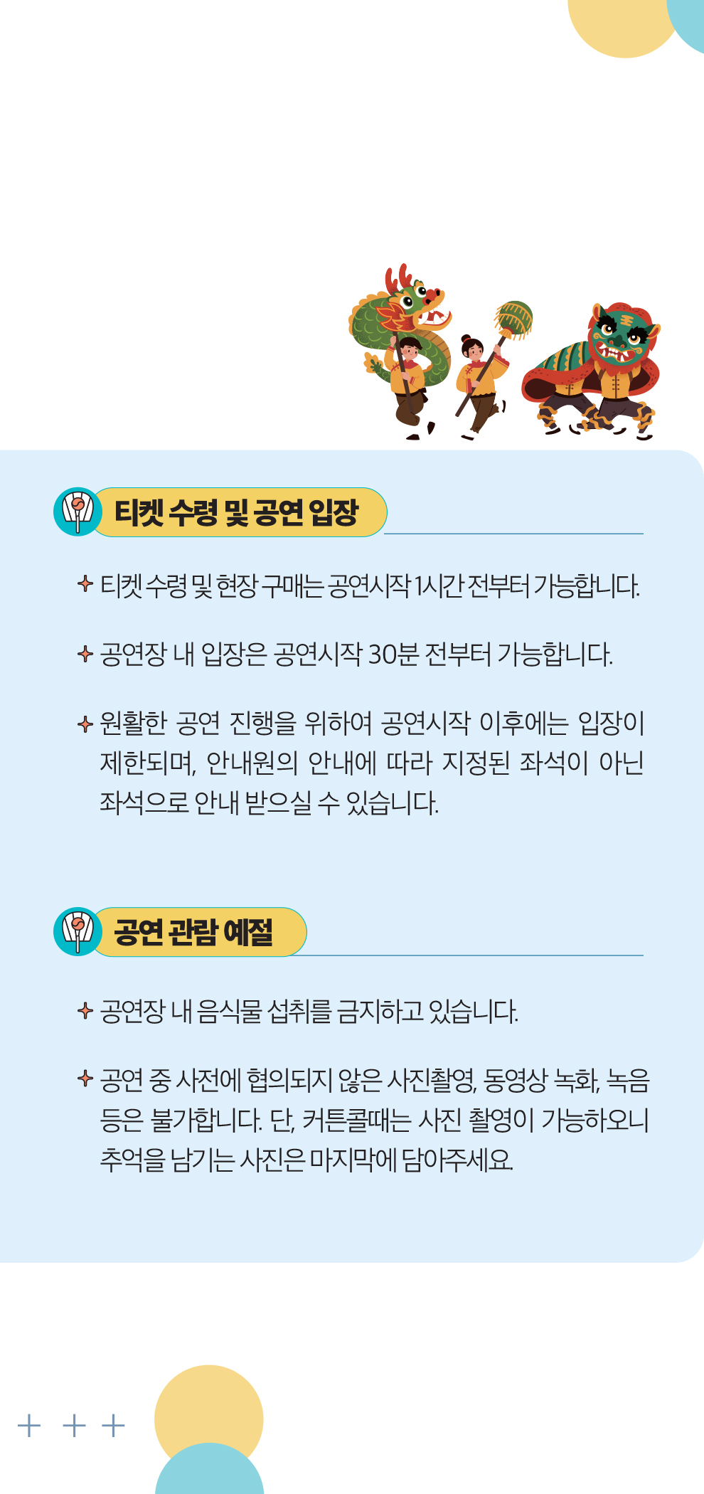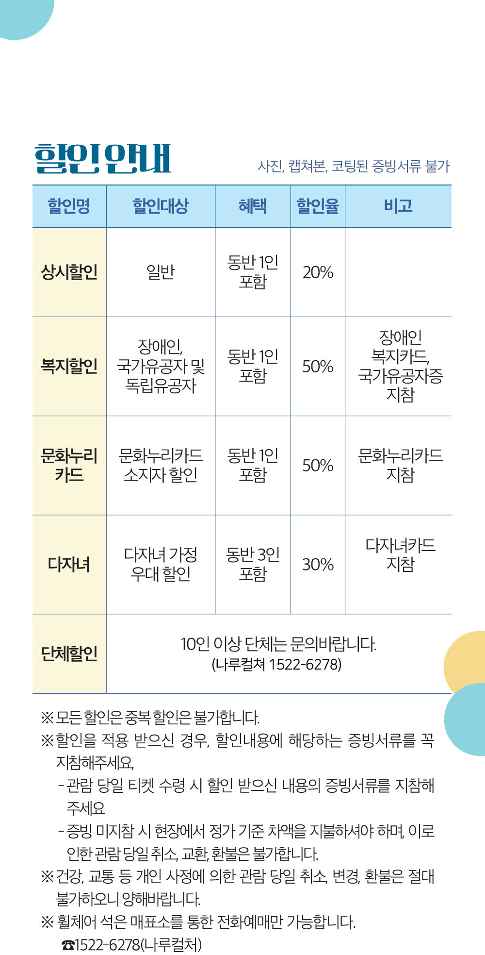 - 할인정보 : 상시할인(동반 1인) 20%, 복지할인(동반 1인) 50%, 문화누리카드 할인(동반 1인) 50%, 다자녀 할인(동반 3인) 30%, 단체할인(10인 이상) 40%
