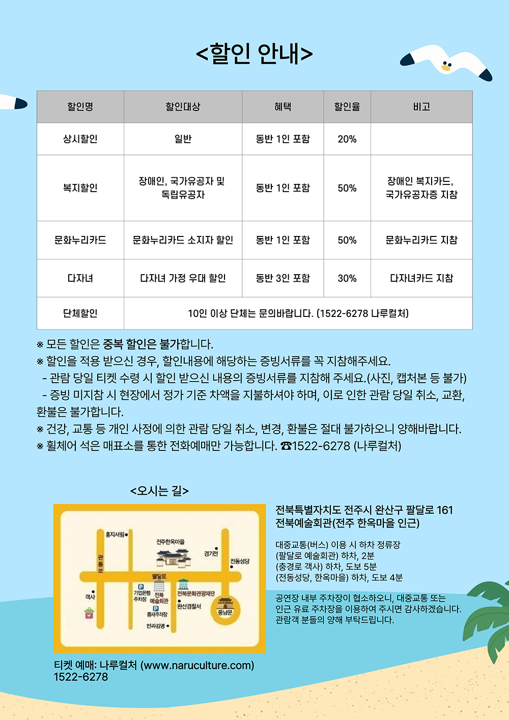 - 할인정보 : 상시할인(동반 1인) 20%, 복지할인(동반 1인) 50%, 문화누리카드 할인(동반 1인) 50%, 다자녀 할인(동반 3인) 30%, 단체할인(10인 이상) 30%